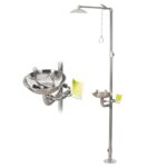 緊急用複合式洗眼ステーション。304ステンレス鋼製、流量調節可能な洗顔装置搭載。二重排水システムで清潔を保ち、安全性を強化。