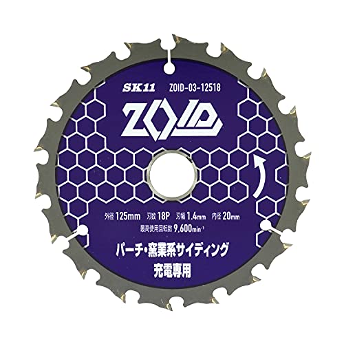 SK11 ZOIDチップソーは、125mm×18Pのサイズで、充電丸鋸専用です。パーチクルボードや窯業サイディングに最適な性能を提供します。