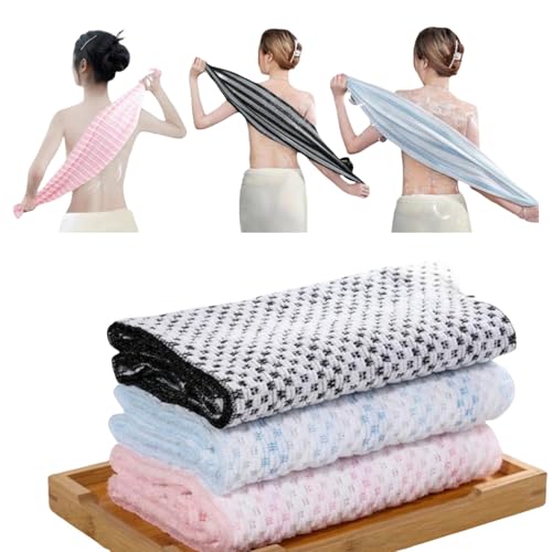 ボディタオル3条装(ブラック、ブルー、ピンク)。痛くない泥バスタオルで、強力な角質ケアが可能。背中、首、お尻の黒ずみ対策に最適。男女兼用。